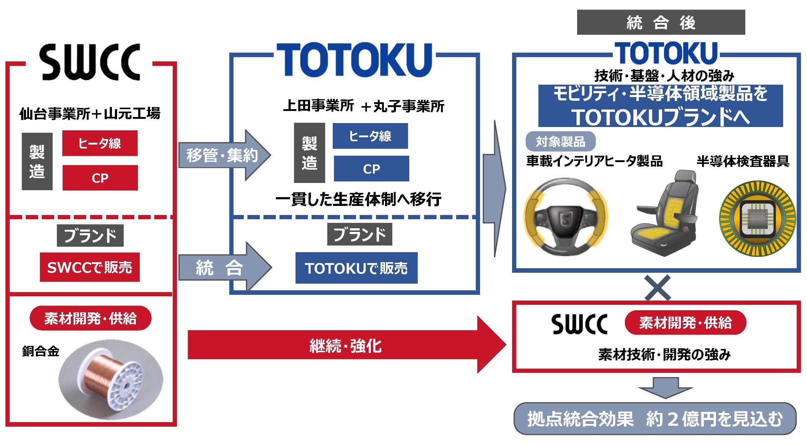 SWCCグループは、銅事業のさらなる成長と収益性向上を目指し、川下領域への製品展開を行っており、この一環として、本年4月、「細く、軽く、小さく」を特長とした高収益性の製品群を持つTOTOKUをSWCCにグループインいたしました。TOTOKUは、モビリティや半導体などの成長市場をターゲットに、車載インテリアヒータ線や半導体検査用CPの製造・販売を成長事業のひとつと位置付けており、リソースを集中して事業の拡大を図っております。SWCCも同じ事業を有しているため、このたびSWCC仙台地区にある製造拠点をTOTOKUへ移管・集約し、TOTOKUブランドに統合することといたしました。これにより最適な製造および販売体制を構築し、経営効率の向上を図ってまいります。今後、SWCCは「素材、銅合金」をTOTOKUに供給するとともに、開発力を生かし、高強度・高硬度化、高伝導率化を目指した素材開発に特化します。これにより、素材開発から製品加工・販売までのグループ一貫体制を確立し、製造技術と顧客基盤の強みを最大限に活用することで、多様なニーズに柔軟に応える体制を整え、競争優位性のある事業展開を推し進めてまいります。