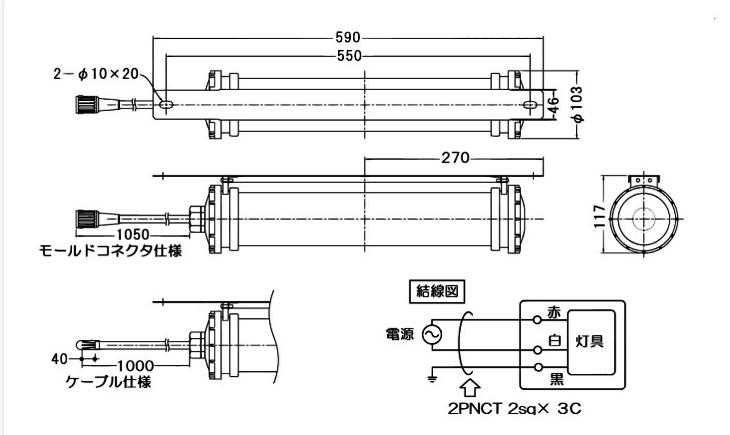 | 電源ケーブル | 2PNCT 3芯 2sq 長さ1m モールドコネクタ付 コネクタなし仕様も対応可能です |